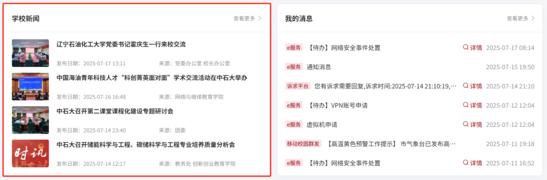 新版融合門戶堅(jiān)守融合、智能、便捷、高效理念,以簡(jiǎn)潔、干凈、美觀、大方為視覺(jué)錨點(diǎn)。頂部紅色欄搭配?;眨瑐鬟f校園文化底蘊(yùn),構(gòu)建品牌識(shí)別記憶點(diǎn)。搜索欄醒目布局,功能入口整齊排列,數(shù)據(jù)看板、應(yīng)用系統(tǒng)等模塊有序鋪陳,信息層級(jí)清晰,既讓師生能快速捕捉關(guān)鍵內(nèi)容,又以簡(jiǎn)約美學(xué)營(yíng)造舒適直觀的交互體驗(yàn),讓實(shí)用功能與視覺(jué)享受深度融合,重塑校園數(shù)智化服務(wù)的視覺(jué)感知。