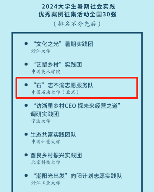 今年暑假,浙江日?qǐng)?bào)潮新聞推出2024年大學(xué)生暑期社會(huì)實(shí)踐優(yōu)秀案例征集活動(dòng),共吸引全國(guó)近千支實(shí)踐團(tuán)隊(duì)報(bào)名,通過(guò)團(tuán)隊(duì)自薦、材料審核、專家評(píng)審,評(píng)選出前30強(qiáng)優(yōu)秀社會(huì)實(shí)踐隊(duì)伍。近日,評(píng)選結(jié)果揭曉,中國(guó)石油大學(xué)(北京)“石”志不渝志愿服務(wù)隊(duì)入選。